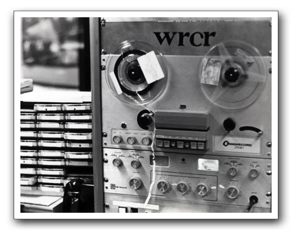 Magnecord tape deck in the equipment rack of the lower Burpee WRCR studios.yearbook photo scaned by Stina Tanaglia