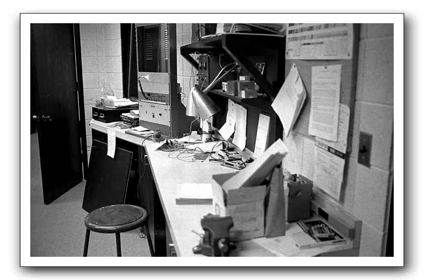 The engineering work bench. The temporary equipment rack in the previous picture has been replaced and more equipment has been added including a patch panel.Ross Hunter photo, Fall 1970 photo