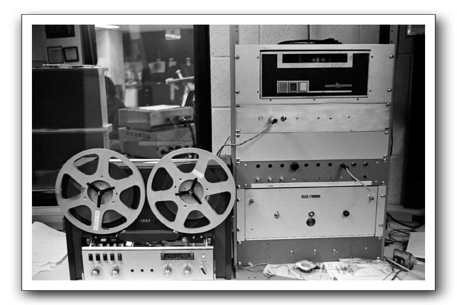 The automation system used a Revox reel-to-reel tape maching and a Criterion cart machine (seen at the top of the equipment rack). On air contest named the automation system OSCAR...Occasionaly Silent Criterion And Revox.