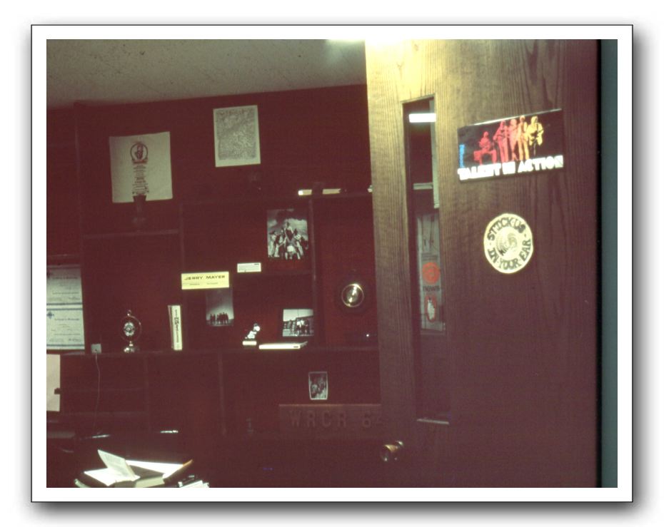 This is a dark copy of a slide of the WRCR office in 1973. There's that "Stick Us In Your Ear" circular flyer again. High on the wall is a copy of Parnell Nelson's drawing for the "Phone Thing" campus phone directory that WRCR published and some old staff pictures. In the center is a sign that says "Jerry Mayer, General Manager". At the center left is an old microphone that shows up in some WRCR pictures from the 1960s.