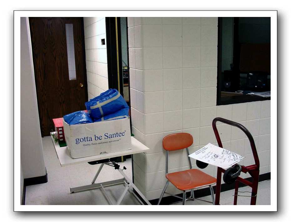 Sandy Ballin visited the RC campus in the Fall of 2004 and found the lower Burpee WRCR studios abandoned. The carpet is gone, apparently a casulty of flooding. The hallway on the left leads to Studio B, the control room is on the other side of the window to the right. Note that the window glass is missing and that the "on the air" sign is now a hole in the wall.