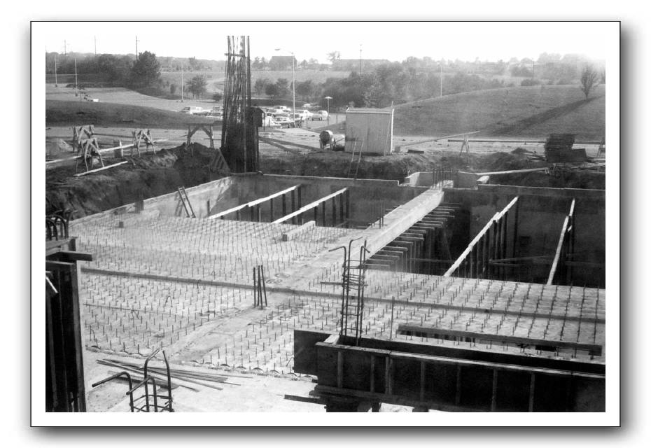 This picture, taken from the originial Burpee Center building, showswork on the addition in the spring of 1969. The WRCR studios will be in the far left corner...about the area with out a ceiling on the left.Mark Groth photo