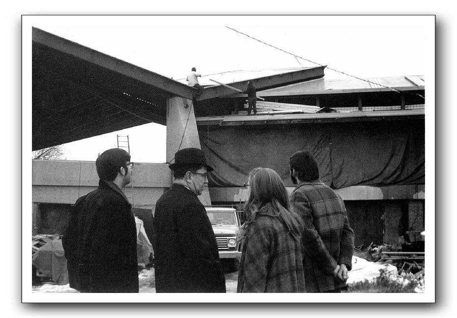 Construction progresses on the Burpee Center addition in the winter of 1969-70. (l-r) Mark Groth: John Spence, College VP for Development; Kathy Hackwith; and Ken Flack discuss the space that will house WRCR's new studios.Ross Hunter photo