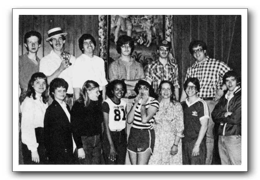 Back row l-r: Dave Paulsen, Mark Beakey (holding a microphone), Mike Morris, Keith Doering, ??, Doug Jones