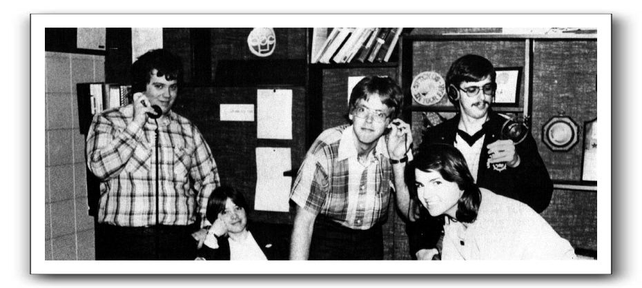 There's that "Stick Us In Your Ear" sign again. Linda says "This photo was to demonstrate all our different jobs. Notice me, the GM, not doing anything while the others are all busy. Chris, the Traphik Manager, is typing, but that's cut out of the picture. I don't think Chris ever had an on-air show."