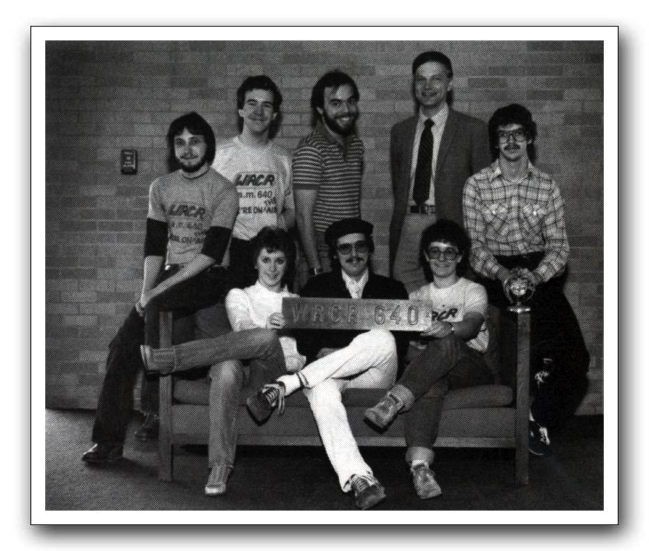 Members of the WRCR Executive Board in 1983-84. Front row (l-r) Laura Godfrey; Paul Watson, General Manger; Michele Mueller. Back row (l-r_ Mike Herbert, Business Manger; Tom Allen, Chief Engineer; Fred Brodsky, Ray Baker, Advisor; Curt Anderson