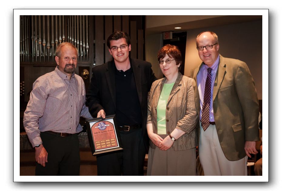 Three WRCR alums visited Rockford College on May 2, 2012 to present the first two John D. Spence Awards. l-r Glen Moss '70, Vince Chiarelli '12, Cece Forrester '72 and Bern Sundstedt '77. Bern was given the award for 2011 and Vince for 2012. John Base, presenter of the Spence Award is not pictured.