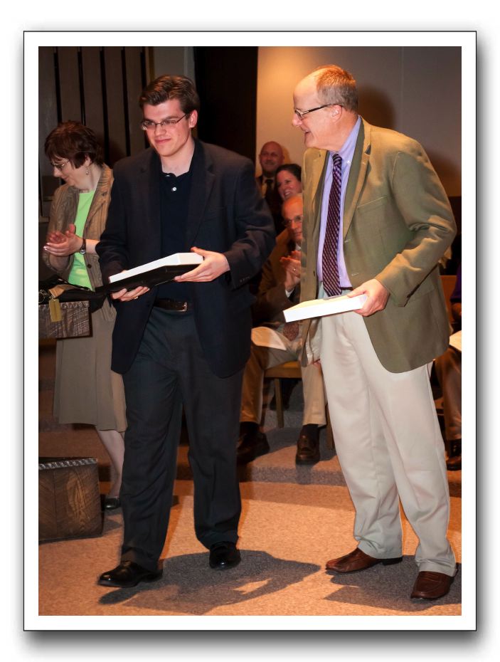 May 2, 2012. Rockford College Radio General Manager Vince Chiarelli '12 and Rockford College Vice President for Institutional Advancement Bern Sundstedt '77 were the first two winners of the new John D. Spence Award for contributions to Rockford College Radio.