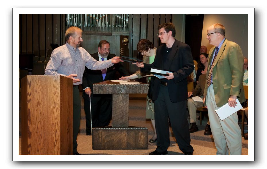 WRCR Alum Glen Moss (l) presents a framed copy of a “Welcome back” note from Chicago radio personality Clark Weber to Vince Chiarelli and Bern Sundstedt. The white boxes they are holding contain bow ties in honor of John Spence. In the background, John Bace and Cece Forrester.