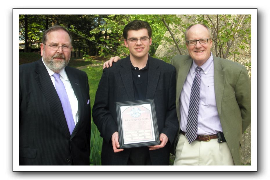 John Bace '75 , Vince Chiarelli '12 and Bern Sundstedt '77 outside Fisher Chapel following the May 2 awards ceremony where John presented the newly created John Spence Award to Vince and Bern in recognition of their work to returning a broadcast presence to the Rockford College campus.