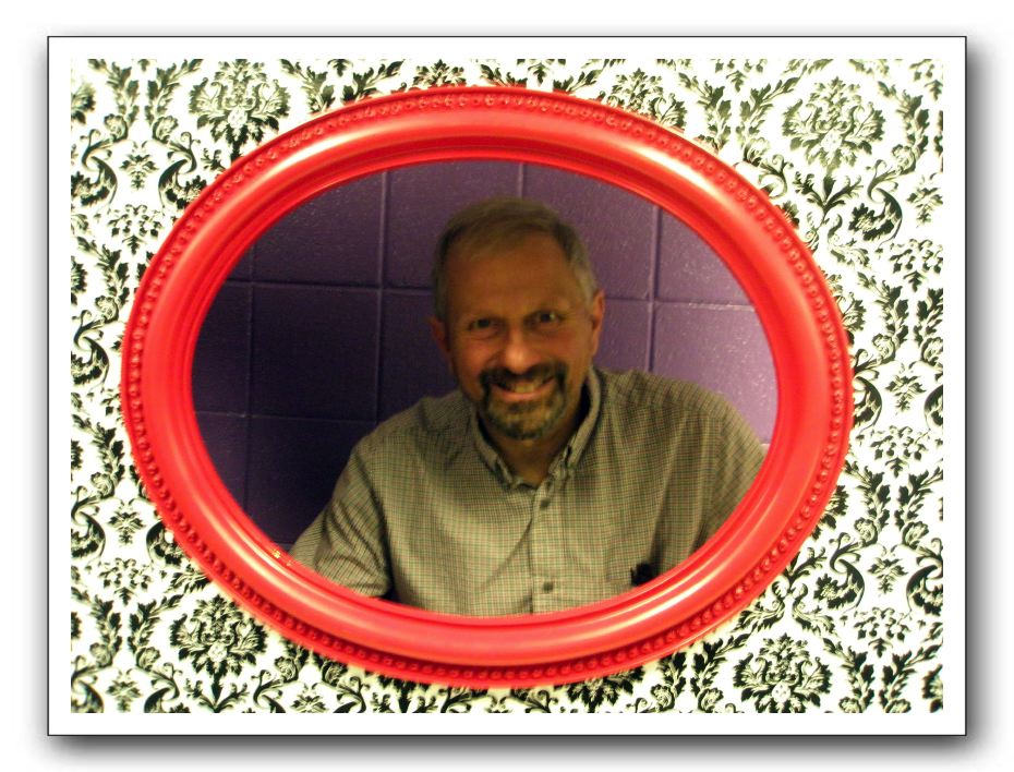 Glen Moss '70 posing in the novelty picture frame panel now decorating Studio B.