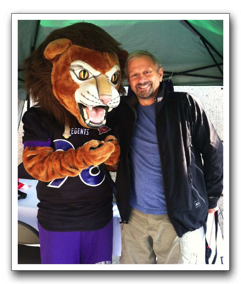 Reggie the Lion (l) meets WRCR Alum Glen Moss at Rockford College's 2012 Homecoming on September 29, 2012.