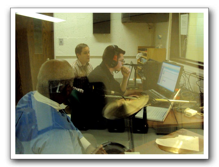 Rockford College President Robert Head (left), Matt Flamm (center) and Vince Chiarelli (right) during Rockford College Radio's inaugural broadcast on January 21, 2011. This photo looking into the control room was taken from Studio A.