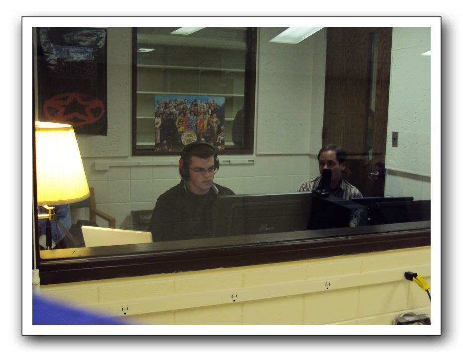 Vince Chiarelli (left) and Matt Flamm (right) are in the control room for Rockford College Radio. It is the same room in lower Burpee Center that WRCR used as a control room. This photo was taken from Studio B. The window in the back looks out to the office.