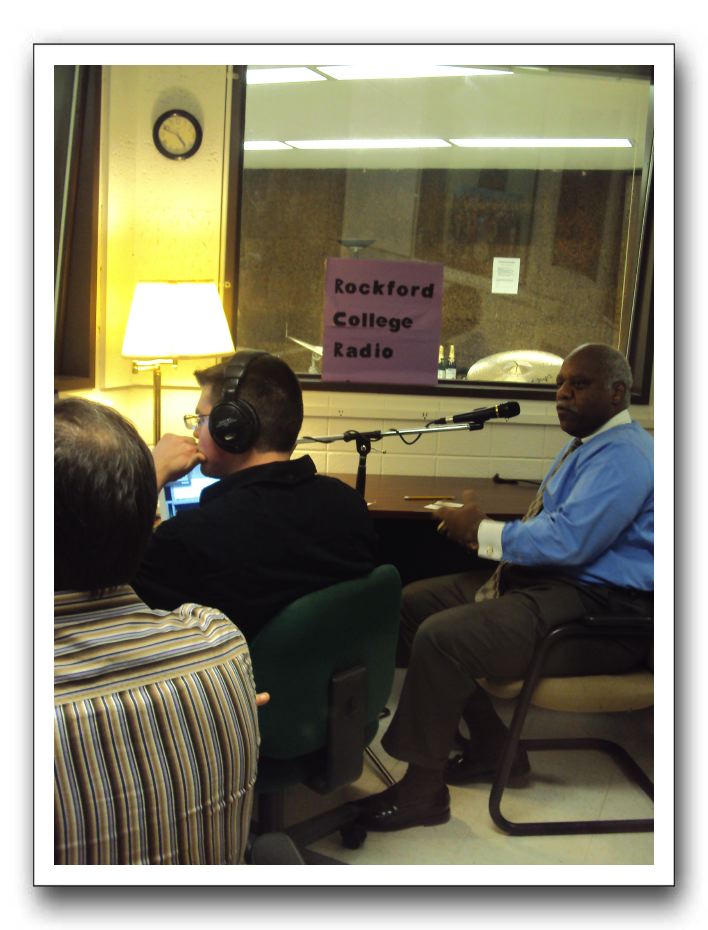 Matt Flamm (left) and Vince Chiarelli (center) interviewing college President Robert Head during Rockford College Radio's inaugural broadcast on January 21, 2011. It is the same room in lower Burpee Center that WRCR used as a control room.Studio A is in the background.
