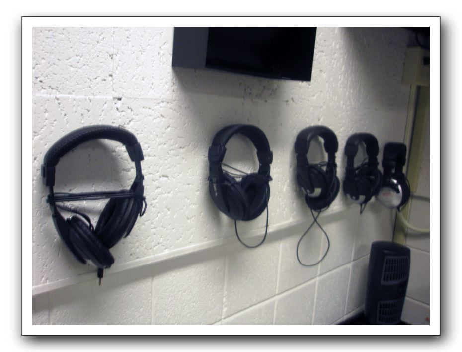 Headphones hang in a row in control room.