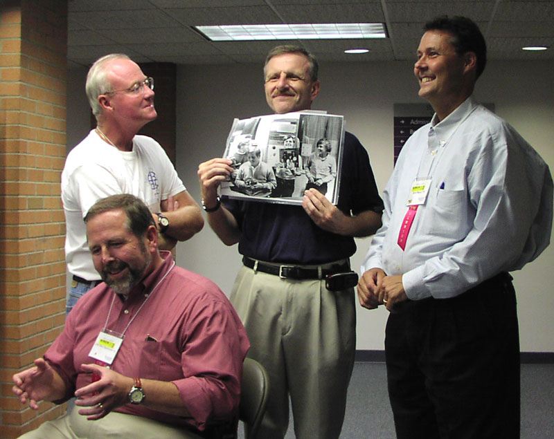 John Bace (front) Tim Coleman, Rick DeJohn and Jerry Meyer recreate a 1972 photo. Rick holds the original. The only thing missing is WRCR. |