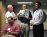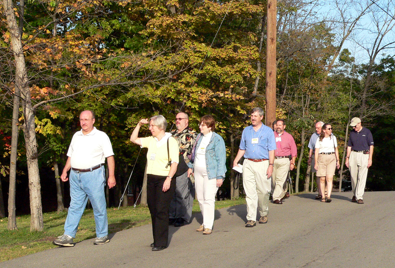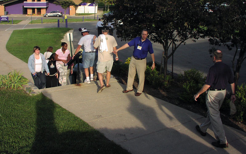 Another picture of the group touring former WRCR sites. This picture was taken behind Scarborough Hall between the Cummings Complex and the last location of WRCR, Lang. | Ross Hunter is taking a picture of Mark Groth taking a picture of Ross and Dave Billingham at the WRCR display area in Burpee. | Ross Hunter presents Brian Dubin a book of WRCR pictures from 1968-1970 in appreciation of Brian's assistance with the Yahoo Group and Reunion preparations. |