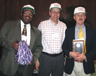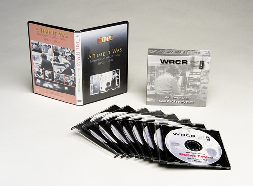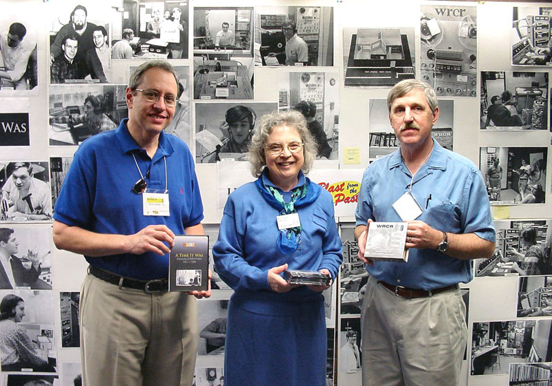 Brian Dubin, left, and Ross Hunter, right, present RC Archivist Mary Pryor with a copy of the WRCR DVD and eight CDs of WRCR audio. |