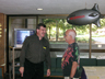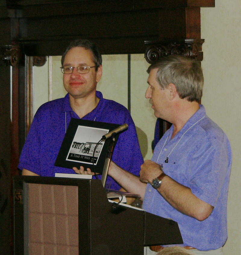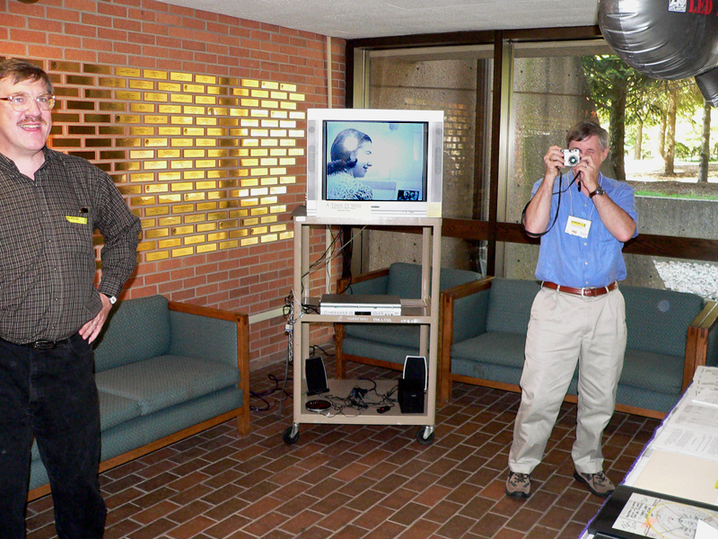Eric Hansen, a founder of WRCR, was given the honor of being the first to sign the studio wall of WTPB. The talked about WROK door is at the left. | Sunday morning of Reunion Weekend and a group met at The Machine Shed restaurant for breakfast. Landis Buchman (l) described it as "the land of giant food". Cece Forrester is at the right. | Dave Billingham (l) and Landis Buchman at the WRCR display area. Note the tv picture over Dave's shoulder. That's Landis in 1969! |