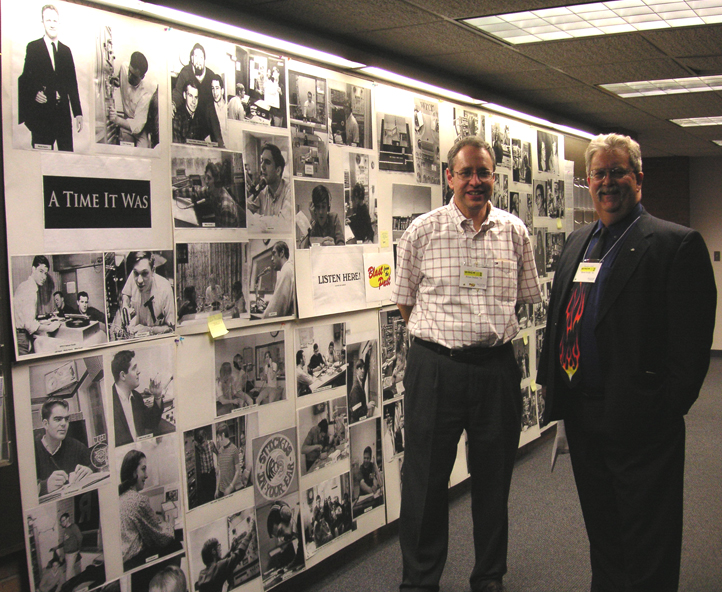 Elijah Lewis, Brian Dubin and Ross Hunter, all from the Class of 1971 and all WRCR Alums. | Brian Dubin (l) and Mark Groth at the wall-o-photos that Brian and wife Rose put together for the reunion. The photos covered 108 square feet on this wall and another. | |