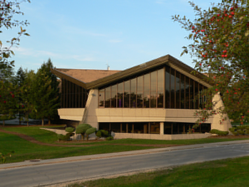 Ross Hunter and Brian Dubin are talking with Colleen Burke of the DECUS staff about the WRCR Yahoo group and reunion. | Burpee Center was the home of WRCR from the fall of 1964 through January of 1985. Here's a nice picture of the Burpee addition which housed WRCR from the fall of 1970 through January of 1985. Mark Groth took the picture. | The first stop on the walking tour was the space to be occupied by WTPB. There's not much in the room right now. L-R Rick Dejohn, Carol Hunter, Rich Hoge and Mike Herbert listen to Dean Kenrick Peters explain how the room will be set up. One nice touch, the outside door came from WROK Radio. |