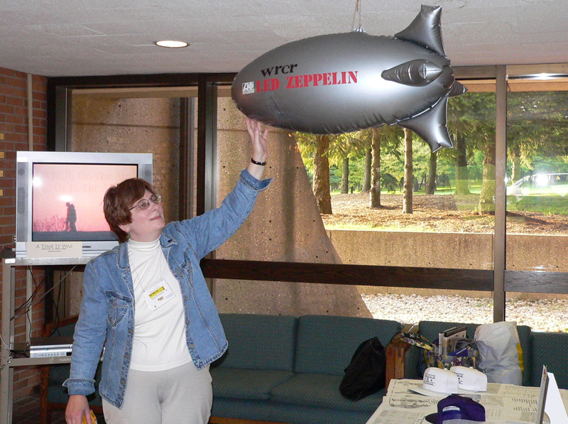 Dave Billingham "Dave Radio" and Landis Buchman with the WRCR Led Zeppelin zeppelin that Dave saved for 35 years. | (l-r) Mark Groth, Landis Buchman, Carol Hempel Hunter and Kathy Hackwith Groth at the Friday night awards banquet. In the foreground, Brian Dubin talks with Abigail Pribbenow wife of college President Paul Pribbenow. | Jessi Hansen talks with President Pribbenow. At the table, Cece Forrester, Mark Groth and Landis Buchman reminisce about the good old days. |