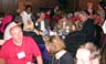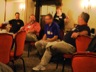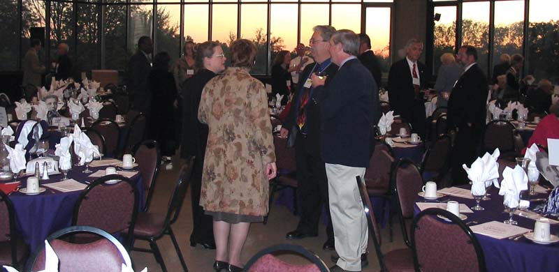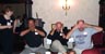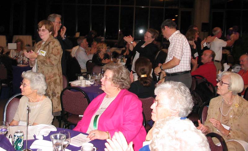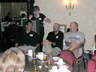 Some of the WRCR group listening to Dean Kenrick Peters talk about WTPB. L-R: Pat Brauer Whittenberger, Ross Hunter, Lucy Geyer Clark, Marv Cutler, Eric Hansen, Jennye Hansen. | Cece Forrester at the podium conducting the first contest of Saturday night. The contestants (l-r): Charlie Branham, Tom Hill, Lewis "Pinky" Miller. | Some of the WRCR Alums dined with RC President Paul Pribbenow Friday night. L-R front: Landis Buchman, Kathy Groth; back, Paul Pribbenow, Cece Forrester, Mark Groth, Brian Dubin. |