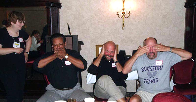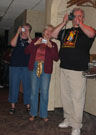 Cece Forrester (left) wonders what she has gotten herself into as (l-r) Charlie Branham, Tom Hill and Pinky Miller psyche up for the first contest round of Saturday night at the WRCR reunion. | l-r: Cindy Bugajski Sundstedt '78, Susie Fuchs '78and Bern Sundstedt '77. Susie received the 2005 Award of Distinction. Both Susie and Cindy were on the WRCR staff. | |