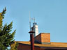 Another picture of the photo display. The yellow stickies identify unknown people in the pictures. The person on the left in the top right photo is Billie Jean King. She's being interviewed by Pam Nehring. | As the old promo for the Glen Moss show says "From high atop Burpee Center..." This is a picture of the WTPB antenna on top of Burpee. It's the silver rod on the near chimney. | Remembering old times, (l-r) Kathy Hackwith Groth, Mark Groth, Dave Billingham, Ross Hunter (partially hidden) and Brian Dubin in front of Colman Library. |