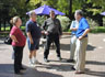On the tour of the under construction studios for WTPB, former WRCR staffers signed their names to the studio wall. | Former WRCR staffers on a tour of the former locations of WRCR. Brian Dubin points the way for stragglers.Some wags referred to the tour as "the stations of the cross." | WRCR founder Eric Hansen (second from right) points to the location of WRCR when it was in upper Burpee Center. Dean Peters led the tour. |