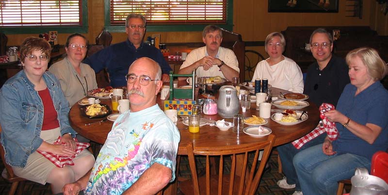 This picture came in titled "The Last Breakfast". L-R: Cece Forrester, Kathy Hackwith Groth, Mark Groth, Ross Hunter, Carol Hempel Hunter, Brian Dubin and Rose Dubin. Landis Buchman is front and center. |