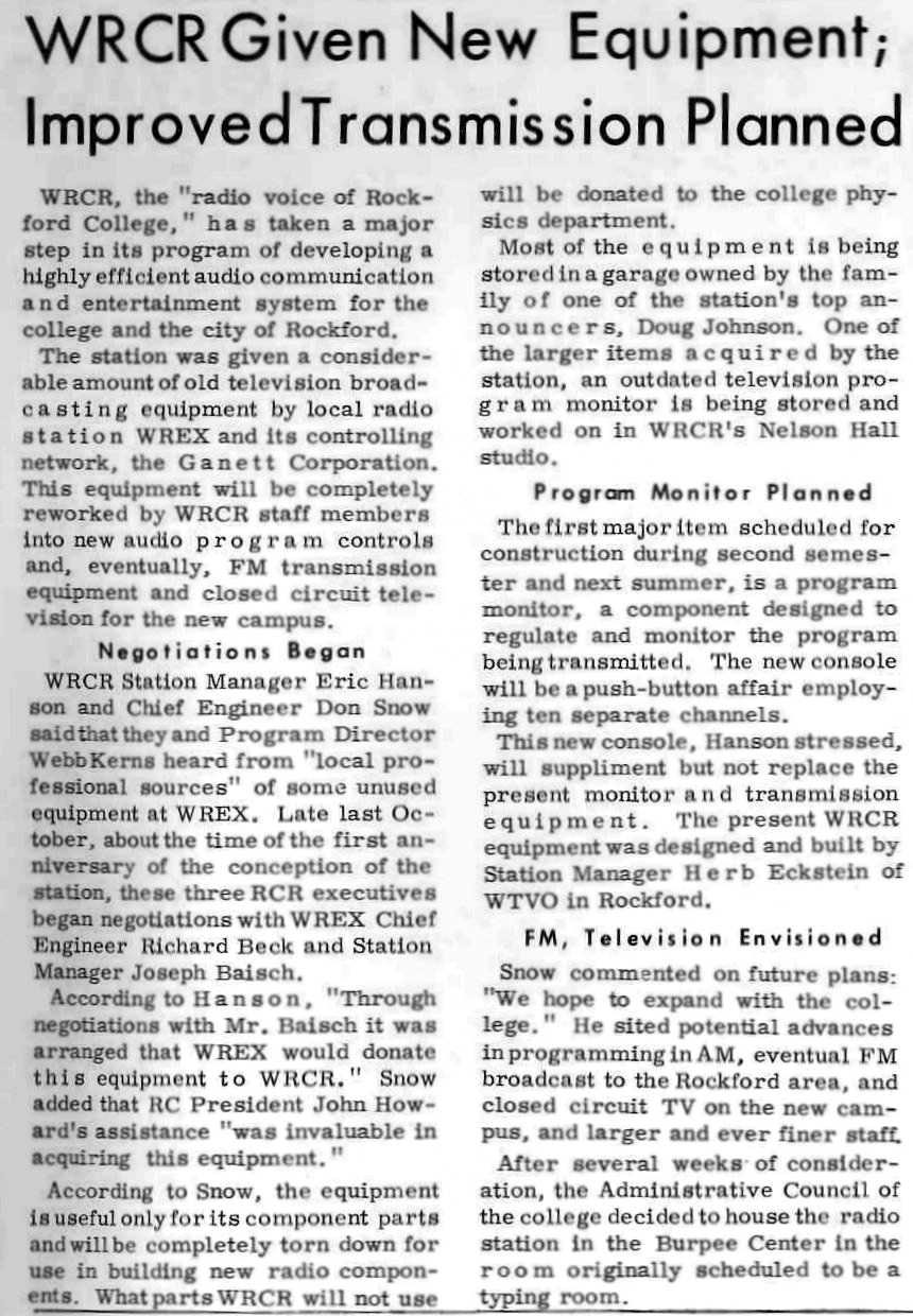 February 6, 1964 - WRCR Given New Equipment; Improved Transmission Planned