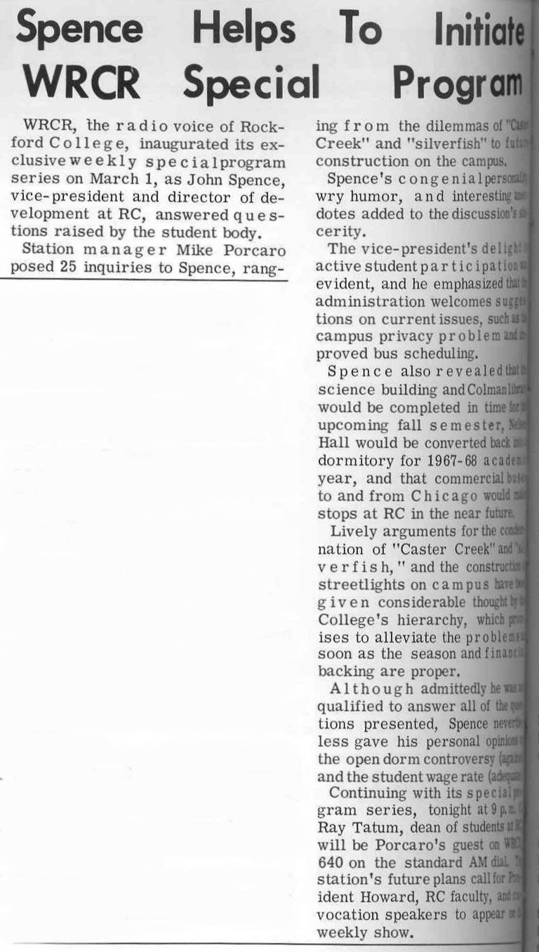 March 8, 1967 - Spence Helps To Initiate WRCR Special Program