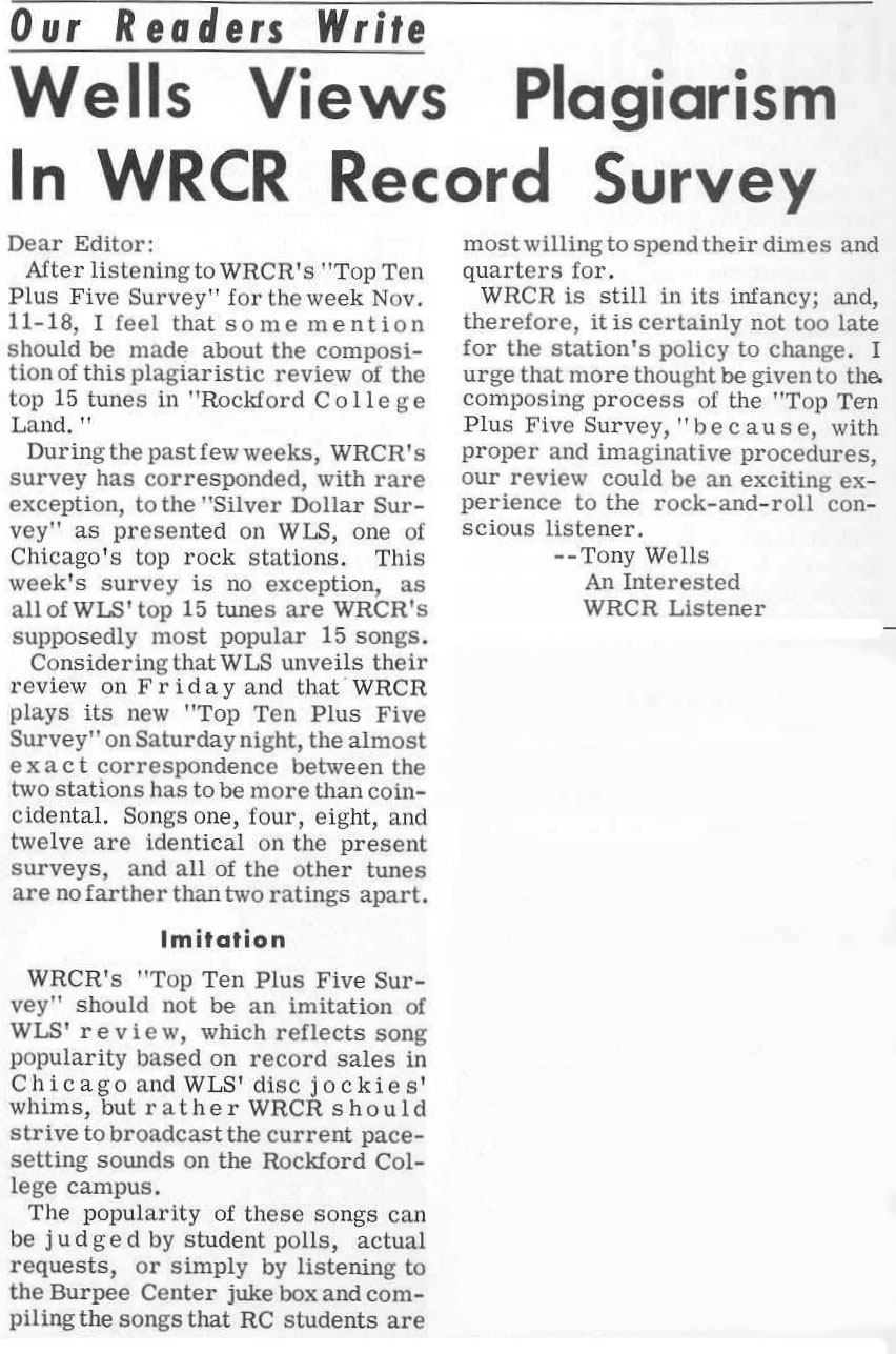November 22, 1967 - Wells Views Plagiarism in WRCR Record Survey (letter to the editor)