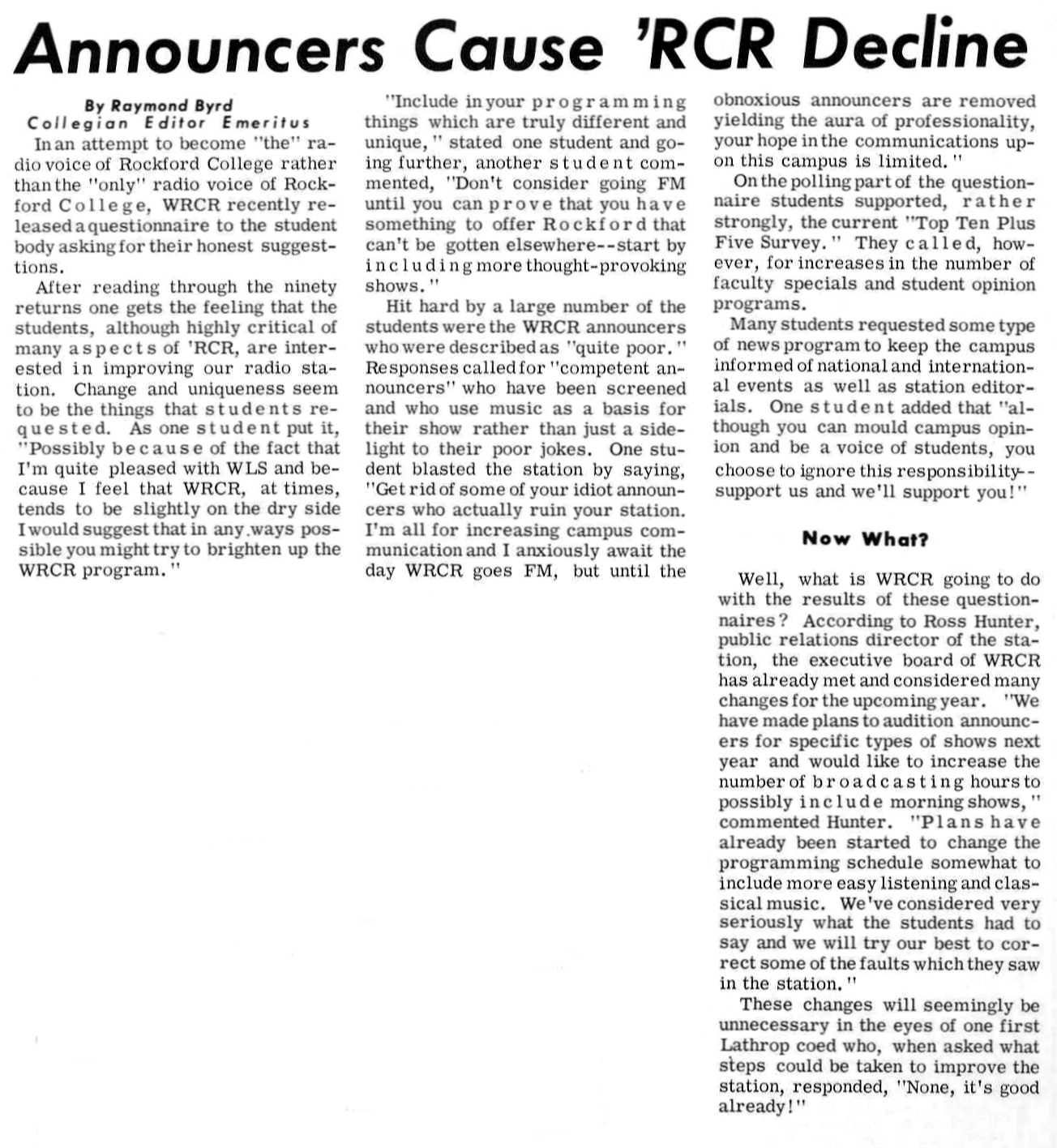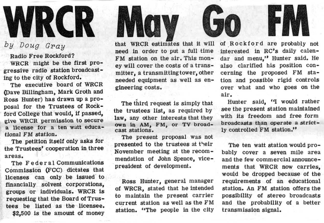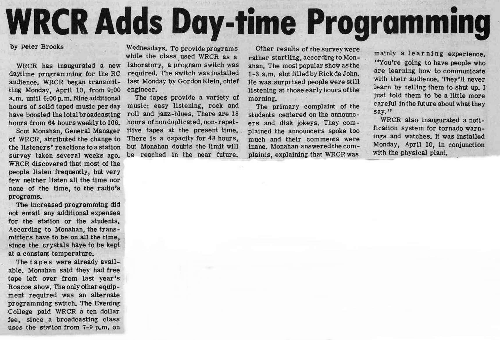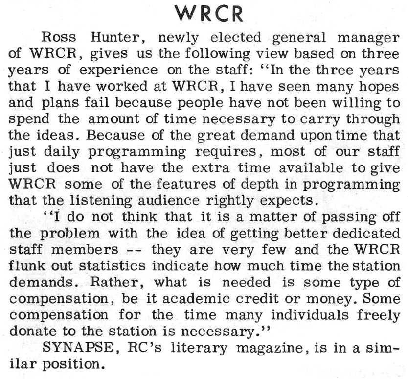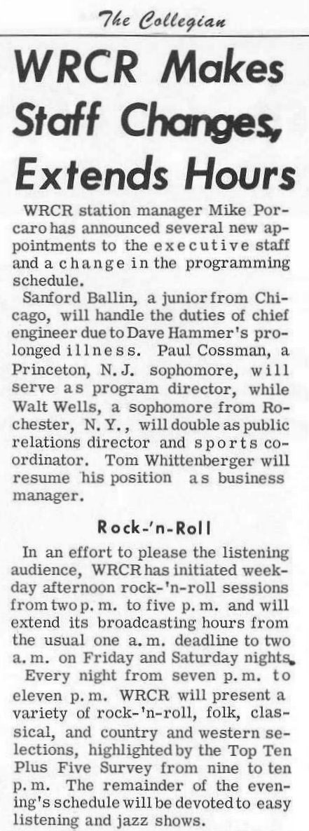 December 13, 1967 - WRCR Makes Staff Changes, Extends Hours