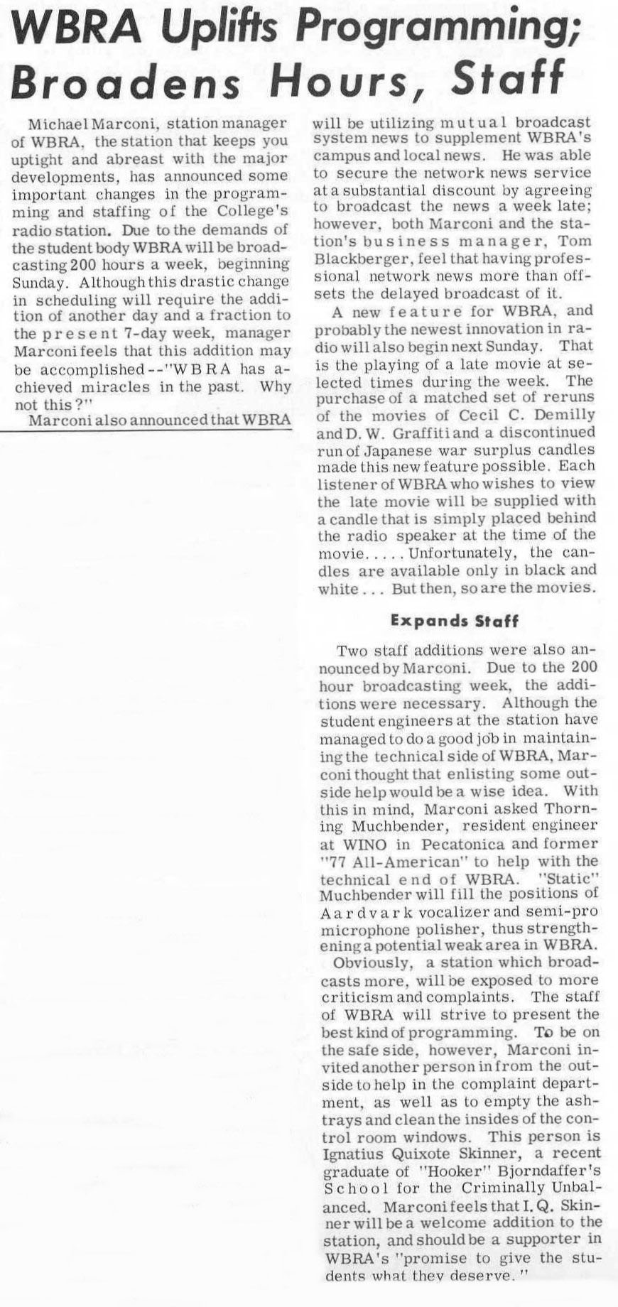 April 3, 1968 - WBRA Uplifts Programming; Broadens Hours, Staff (April Fool issue)