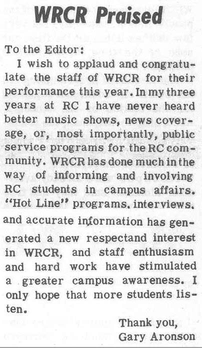 April 13, 1972 - WRCR Praised (letter to the editor)