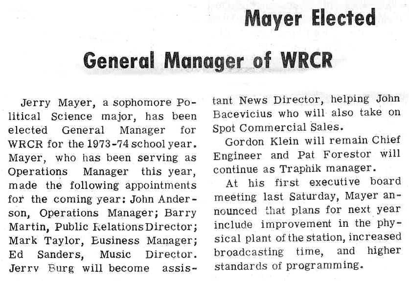 April 5, 1973 - Mayer Elected General Manager of WRCR