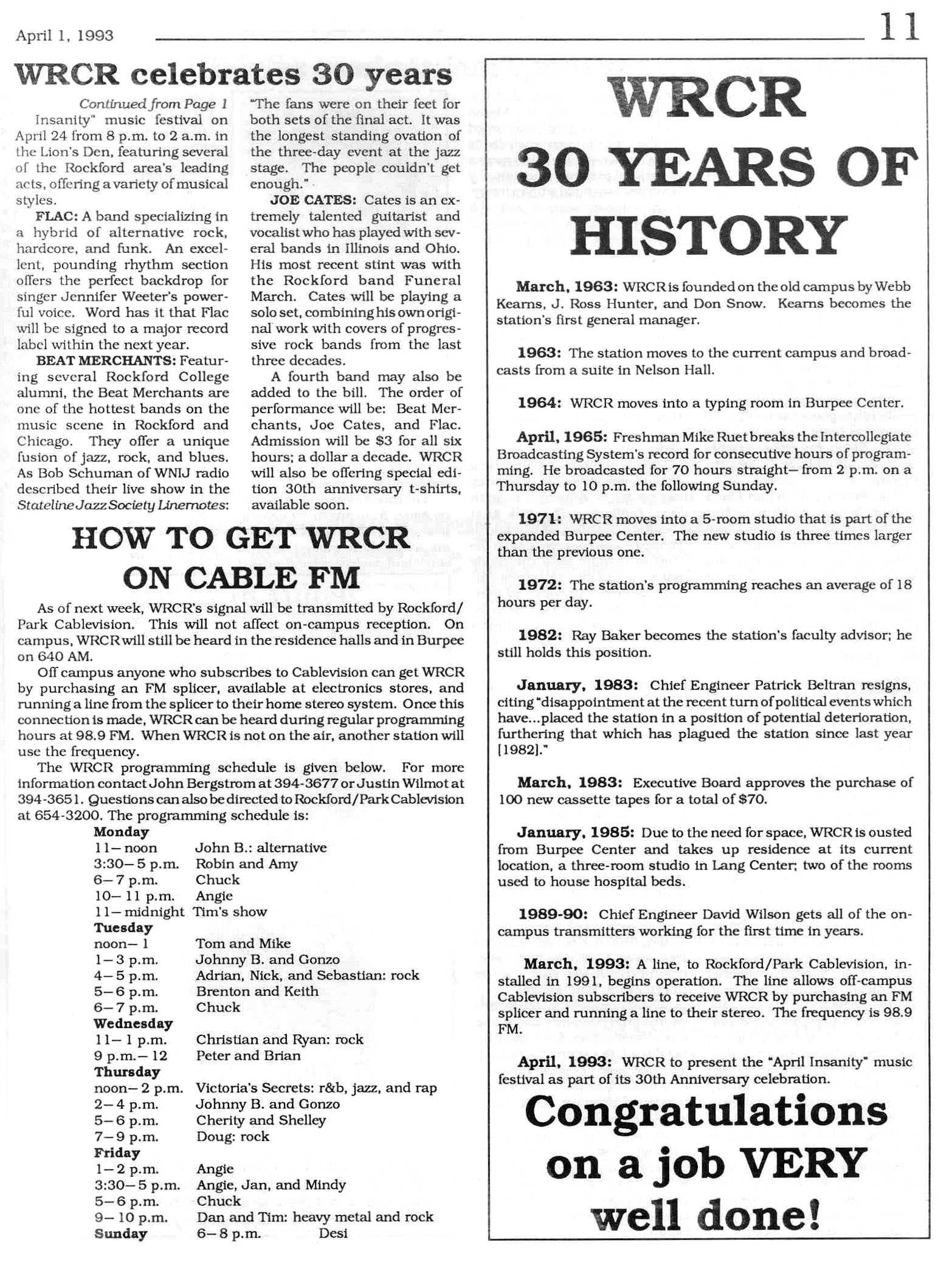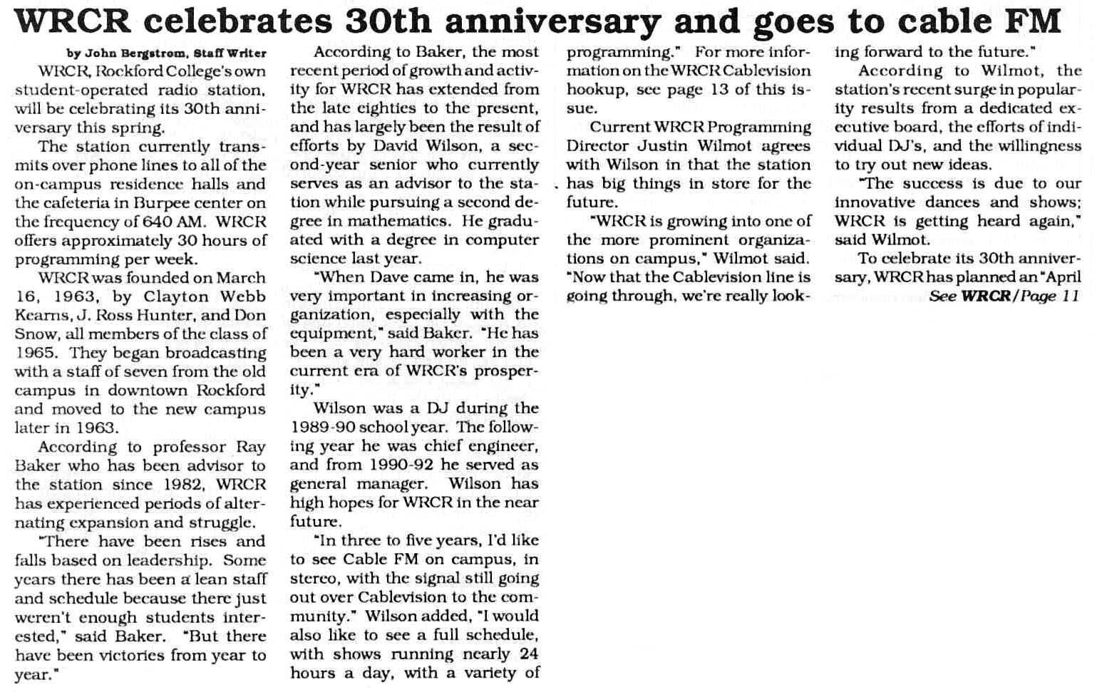 April 1, 1993 - WRCR celebrates 30 years, How to get WRCR on cable FM, WRCR 30 years of history