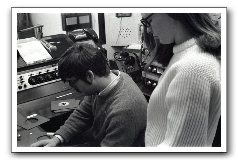 Mark Groth '72 and Kathy Hackwith '72 in the WRCR upper Burpee Center studios. Scanned from a Tri-X 35mm negative.Ross Hunter photo