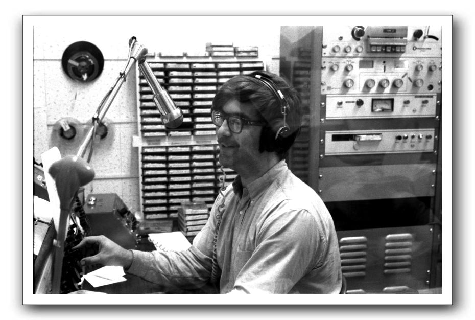 Mark Groth in the WRCR upper Burpee Center control room. March 1970Scanned from 35mm Tri-X-Pan negative.Ross Hunter photo