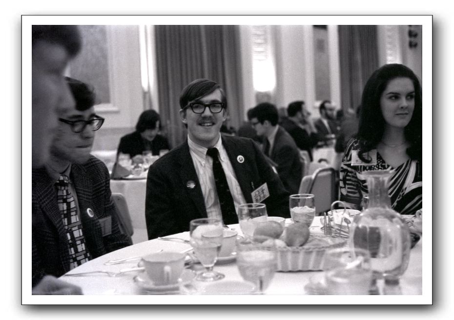 Some of the WRCR group who attended the 31st Annual Intercollegiate Broadcasting System convention at the La Salle Hotel in Chicago, Saturday April 5, 1970. (l-r) Scott Monahan, Brian Dubin, Dave Billingham, Ellen Mahoney
