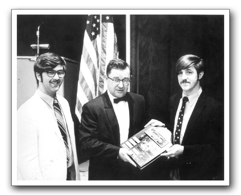 John Spence (center) RC Vice President for Development was the first recipient of the Frank Conrad Award. It was presented to Spence in May of 1970 by Station Manager Mark Groth (left) and General Manager Ross Hunter (right).