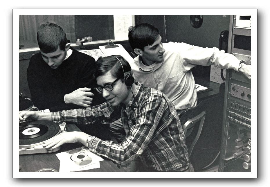 Freshman (l-r) Mike Staehling, Brian Dubin, and Steve Hirsch pose for a 1967-68 yearbook picture in the upper Burpee WRCR control room. This picture is from prior to the installation of acoustical tile on the control room walls.
