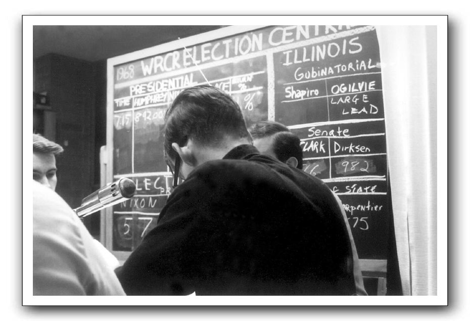 November 5, 1968, 7:15pmWRCR's Election Central covered the election returns. Richard Nixon defeated Hubert Humphrey. (l-r) Sandy Ballin, Kerry Krentzke (back to camera) and Ned Cohen (mostly hidden).Ross Hunter photo