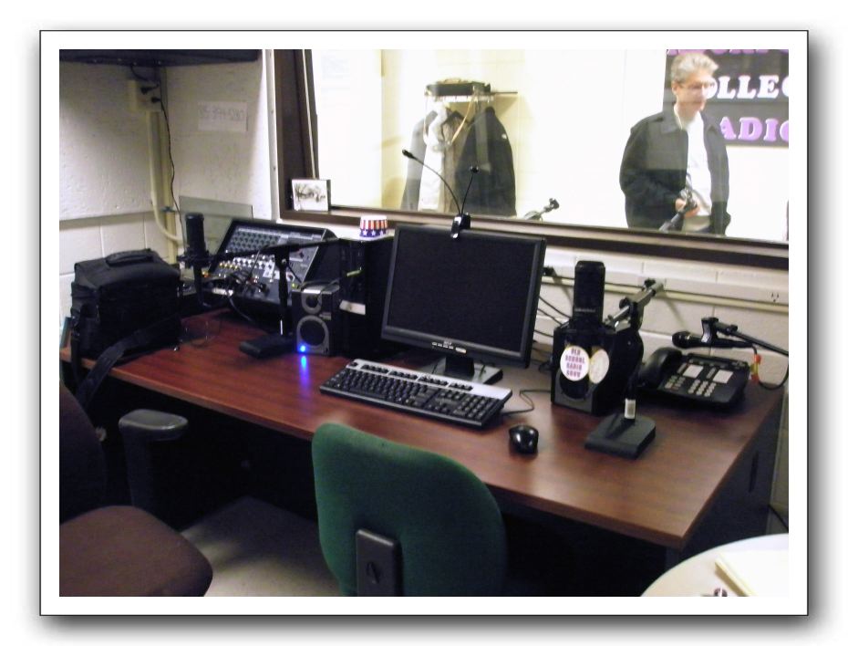 To the left of the monitor is the computer that controls much of the music programmming of the station. To the left of the computer and montior speaker is a mixer for mixing the microphones.