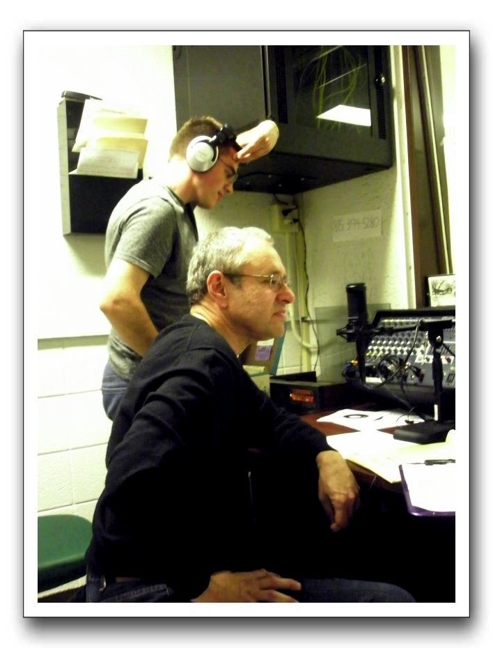 Vince Chiarelli (standing) and Brian Dubin during the broadcast of the Old School Radio Show on Rockford College Radio during the college's 2011 reunion. The black box is the network switch will all the internet connections for Burpee Center.