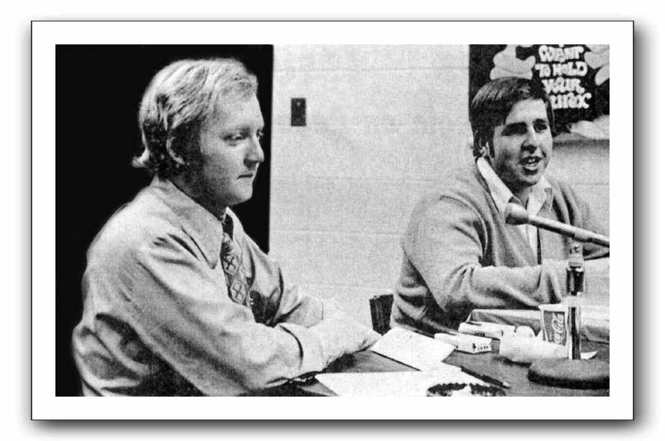 One of three WRCR founders Webb Kerns (left) was a guest on WRCR's Hotlinein 1972, interviewed by John Bace. At the time of this photo Kerns was the Director of Financial Aid for Rockford College.Collegian photo 1972