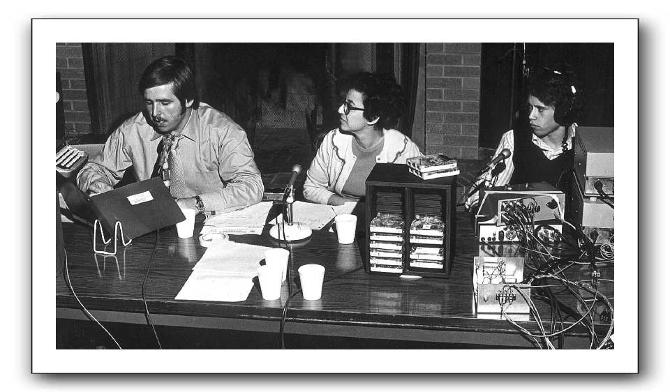 l-r: John Bace, Dr. Mary Carras, and Doug Williamson anchor WRCR's coverage of the 1972 elections. Coverage was broadcast from Forrest Cool Lounge.Collegian photo 11/17/1972